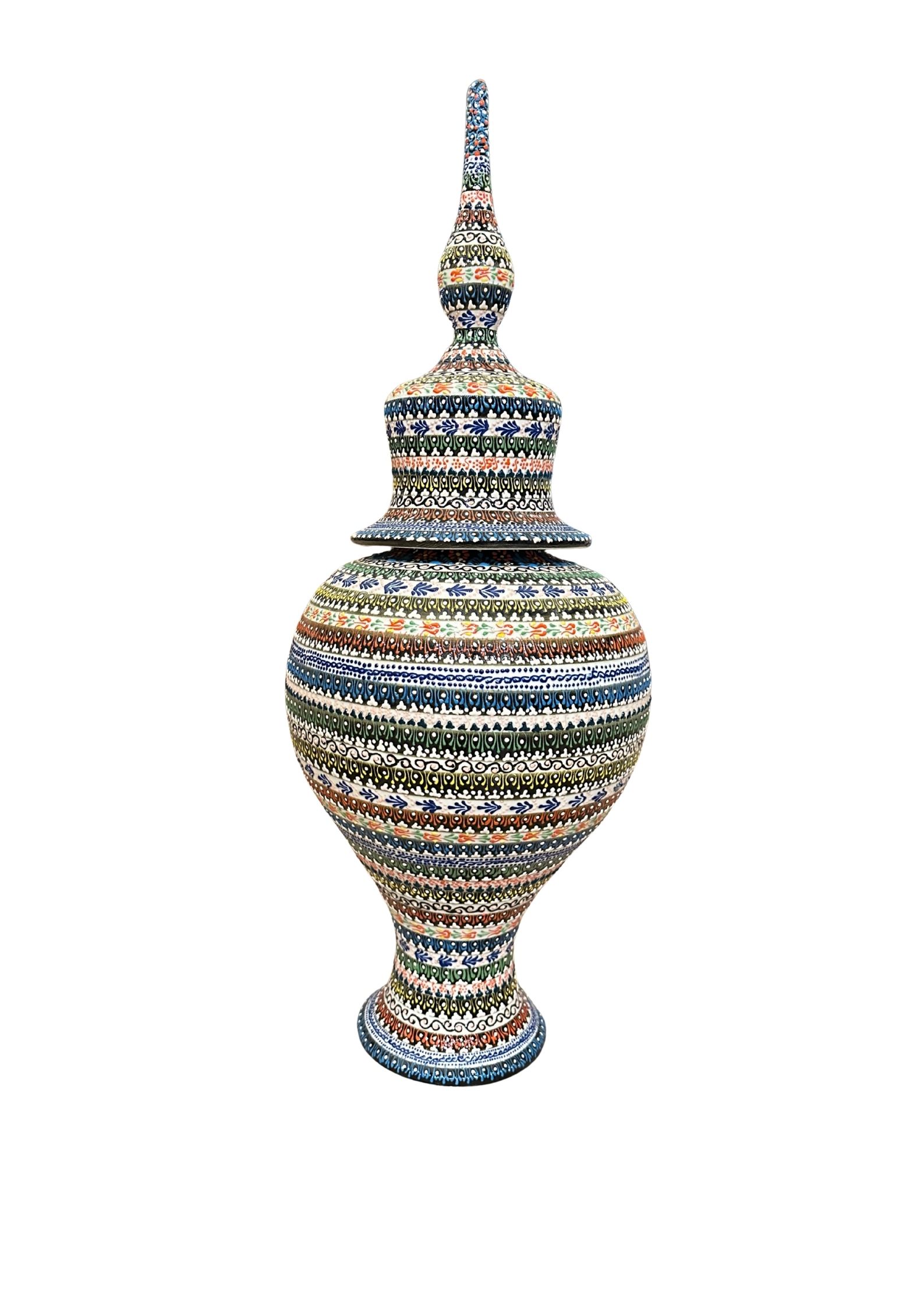 Bu vazo, yüzlerce yıllık bir hikayeyi fısıldayan, Anadolu’nun dört bir yanından toplanmış desenlerin birleşimidir. Her bir renkli şerit, gökkuşağının altından geçen bir kervanın izlediği farklı bir yolu temsil eder. Göz alıcı tepeliği ise, kervanların ulaştığı bereketli ve görkemli şehirlerin minaresini simgeler.