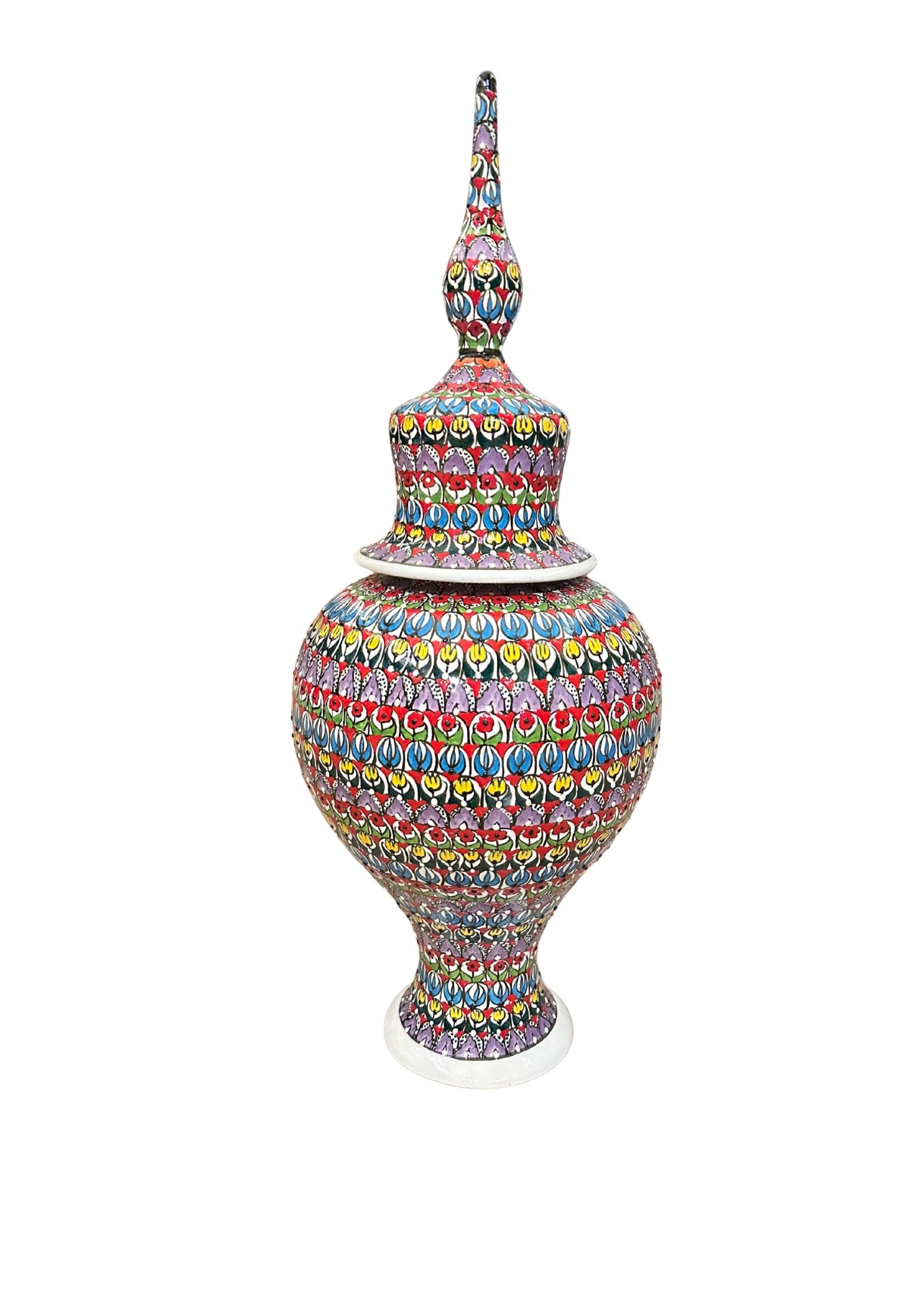 Bu görkemli vazo, Saray bahçelerindeki binbir çeşit lalenin açtığı Lale Devri’nin en şenlikli anlarını yakalar. Üzerindeki tekrar eden canlı lale motifleri, o dönemin sınırsız zarafetini, neşesini ve refahını sembolize eder. Vazoyu taçlandıran ince tepe, bu ihtişamın sonsuzluğa uzanan bir dileğidir.